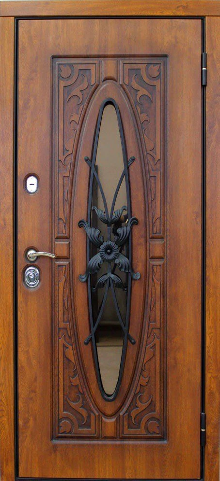При изготовлении двери с отделкой виноритом на заказ, её можно сделать как глухой, так и декорированную вставками из стекла с элементами ковки. Для установки в дом такую дверь можно сделать с применением терморазрыва, и эта дверь будет надежно сохранять в доме тепло, не промерзая и не конденсируя.