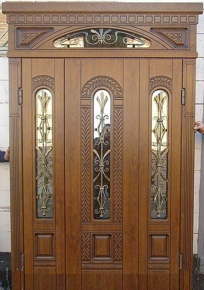 Парадные двери относятся к изделиям премиум-класса. Изготавливаются такие модели из металла толщиной не менее 2,0 мм, конструкция усиливается ребрами жесткости. Основной фактор, делающий парадные двери таковыми – их внешняя отделка. Для декора этих дверей, как правило, используют массив дуба, ясеня или сосны, натуральный шпон, корабельную фанеру, МДФ-панель, покрытую атмосфероустойчивой пленкой Винорит (VINORIT). Декоративные вставки из антивандального стекла, с применением элементов ковки, рисунок, который будет сочетаться с рисунком решеток на окнах, придаст коттеджу неповторимый внешний вид. Можно декорировать дверь витражным узором – и ваш дом заиграет яркими красками. По конструкции парадные двери могут быть как одностворчатыми, так и двустворчатым. При достаточной высоте проема, можно изготовить входную группу с декоративной вставкой сверху – прямоугольную или в виде арки. Терморазрыв в конструкции парадной двери сохранит тепло в доме, и предотвратит промерзание и кондедсирование двери в холодное время года, при этом не требуется обустройство в доме холодного тамбура.